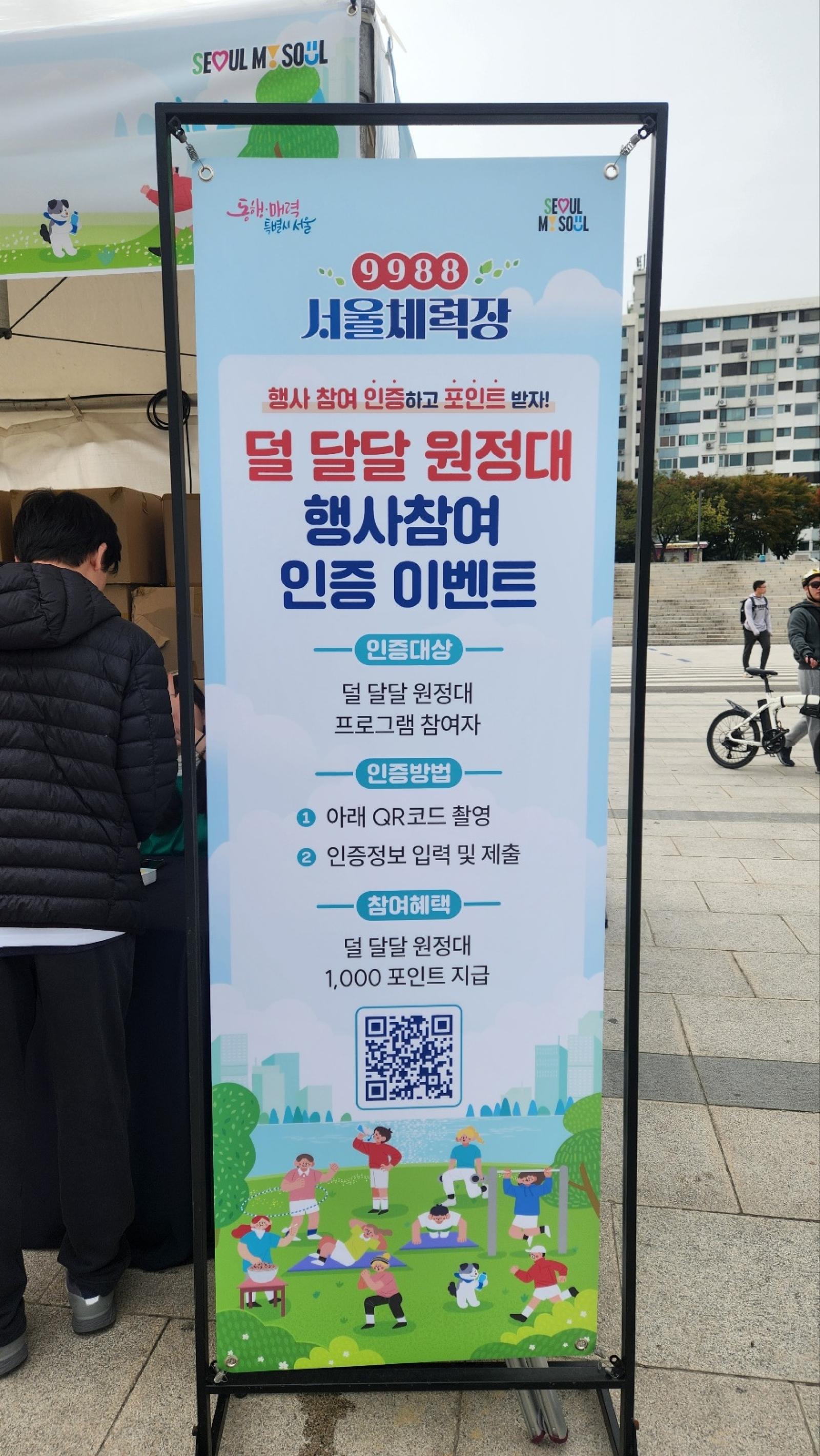 QR코드를 통해 ‘손목닥터9988’ 1,000포인트를 받을 수 있었고 운동으로 하나 될 수 있는 행사여서 혼자가 아니라 이웃과 함께, 서울시민들과 함께 건강을 만들어 갈 수 있는 시간이었습니다. 서울시장님이 오셔서 서울시민의 건강을 챙겨주는 행사였고 건강한 습관을 만들어 갈 수 있는 자리였습니다. 여러분도 함께 건강관리 시작해봅시다.