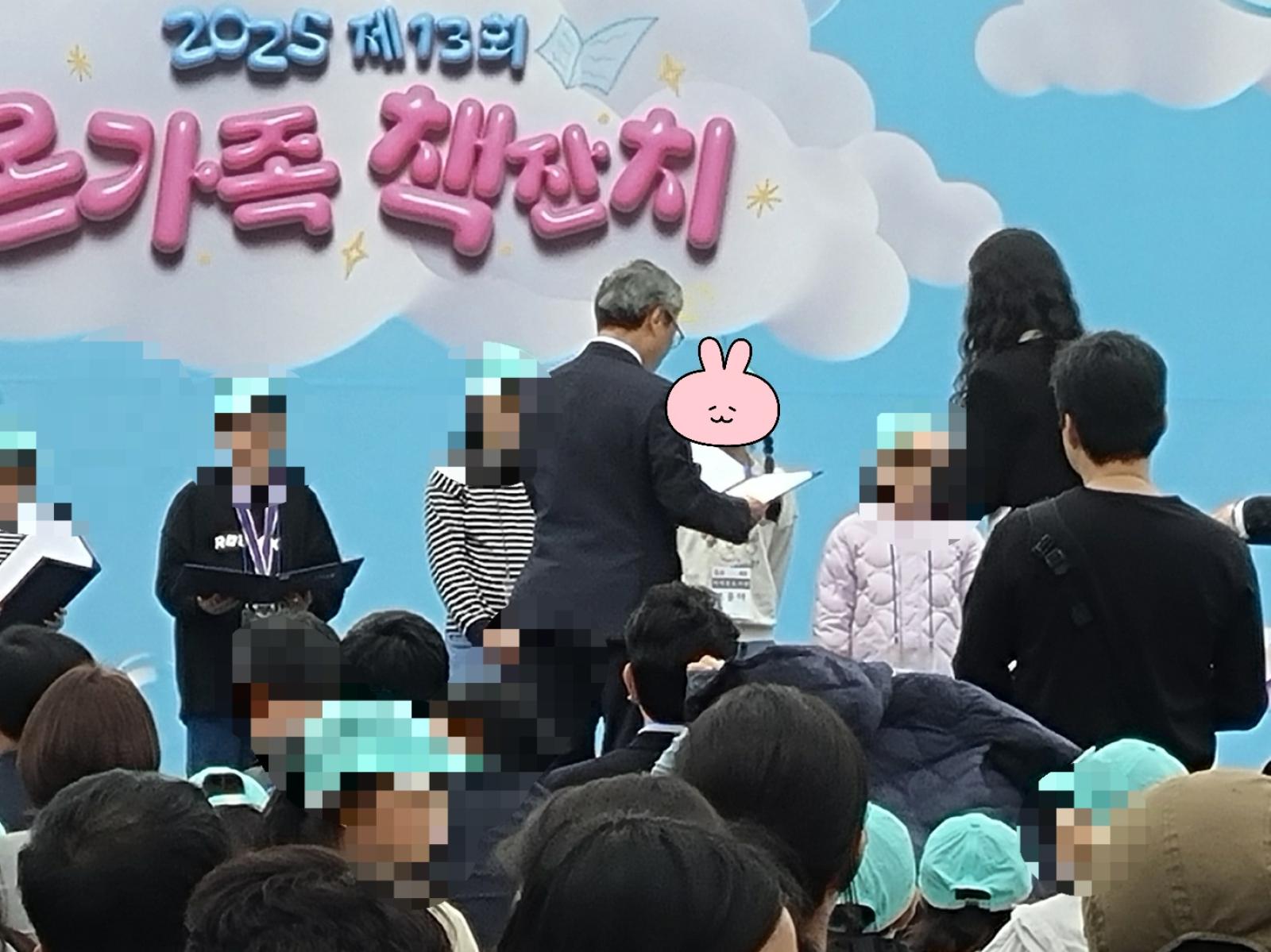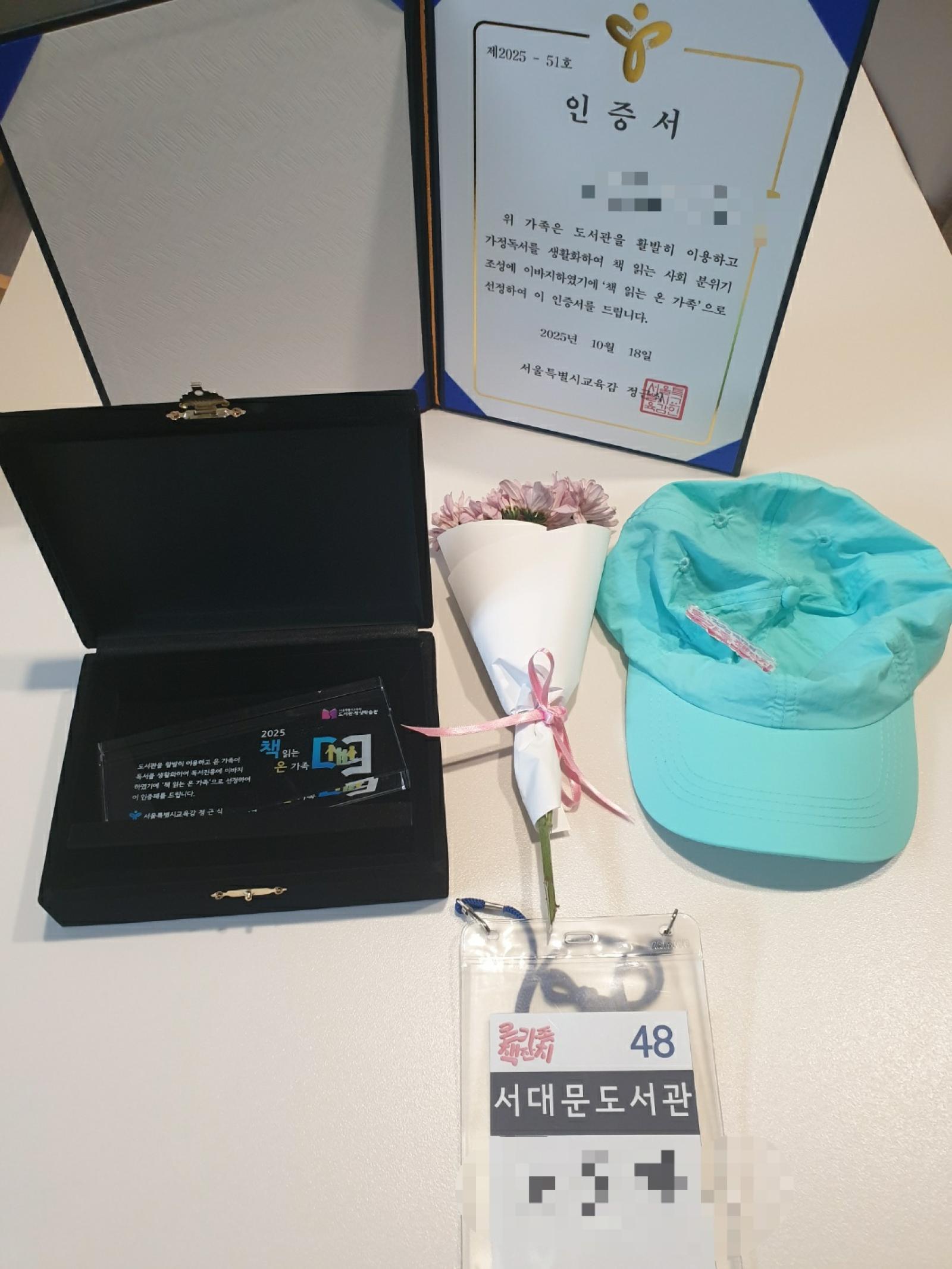 그리고 드디어, 이번 축제에서 가장 가슴 벅찼던 순간! 바로 '책 읽는 온 가족' 시상식이었습니다. 저희 가족처럼 지난 1년 동안 꾸준히 책을 읽고 도서관을 사랑한 100가족을 위한 시상식이었는데요, 무대 위에서 가족대표의 이름이 불리고, 자랑스러운 인증서를 직접 받는 순간 정말 뿌듯하고 기뻤습니다.