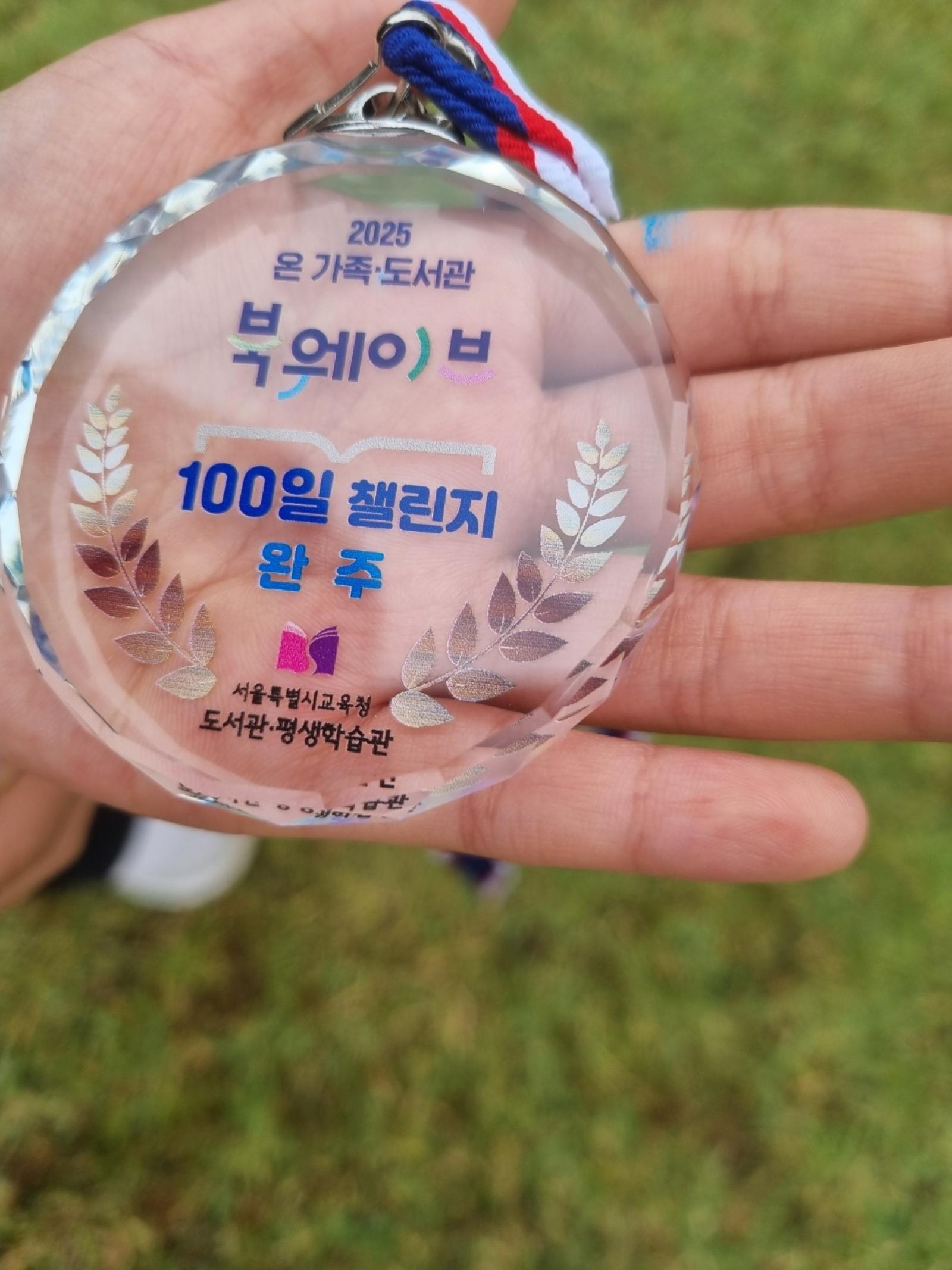 모든 행사를 마치고 받은 자랑스러운 결과물들입니다! 바로 '책 읽는 온가족' 인증서와 인증패, 그리고 이날 함께 받은 '북웨이브 100일 챌린지' 완주 메달입니다. 지난 100일 동안 꾸준히 책을 읽고 도전했던 노력이 떠올라서 정말 기뻤습니다.