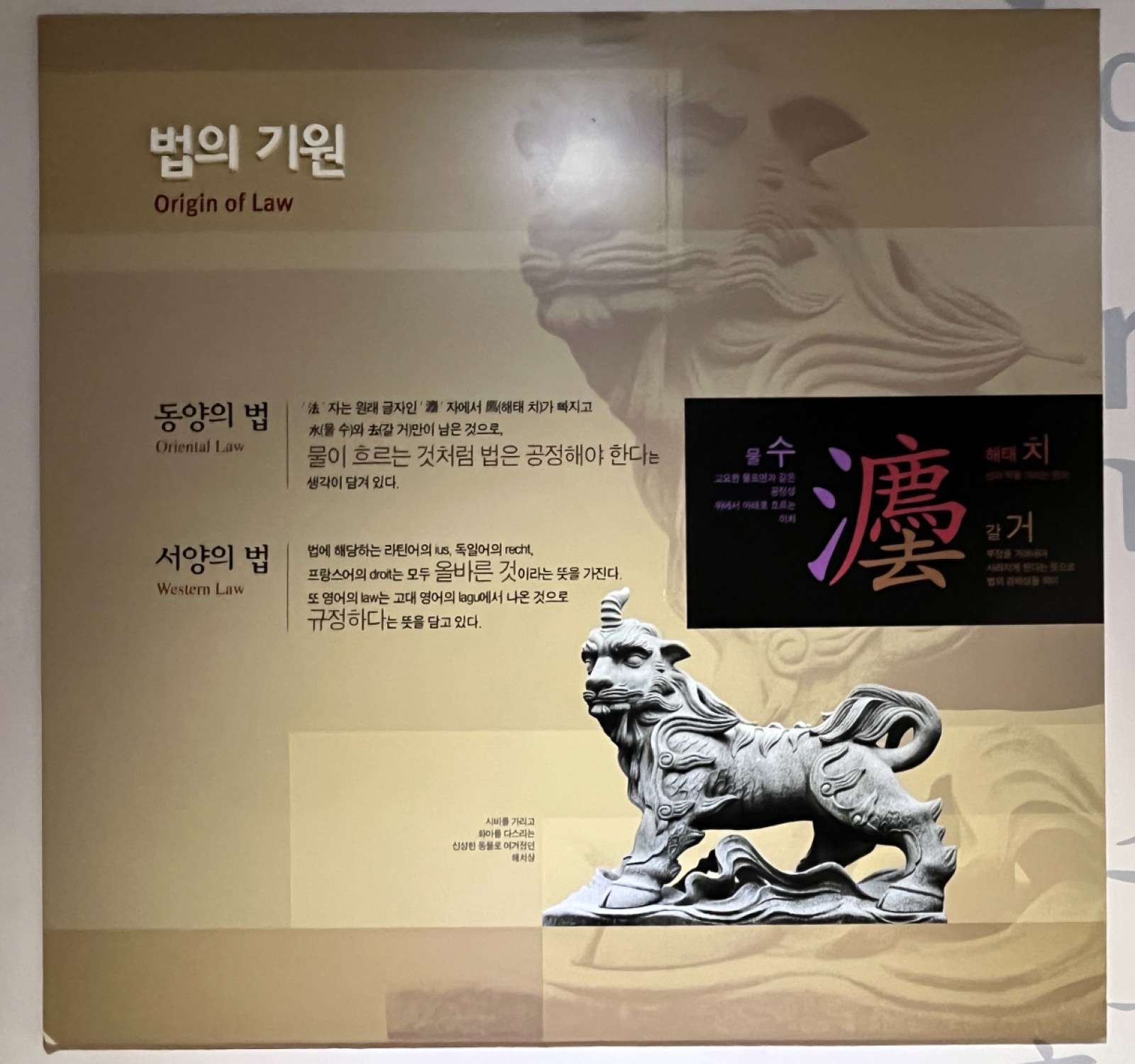 법의 옛 글자는 어떤 뜻을 가진 글자로 이루어져 있을까요? 법의 옛 글자는 ‘물 수’, ‘해태 치’, ‘갈 거’로 구성되어 있는데요. 여기서 ‘물 수’는 고요한 물과 같은 공정성, ‘해태 치’는 옳고 그름을 가리는 정의, ‘갈 거’는 나쁜 것은 가려내어 사라지게 하는 법의 강제성을 나타내고 있다고 해요.