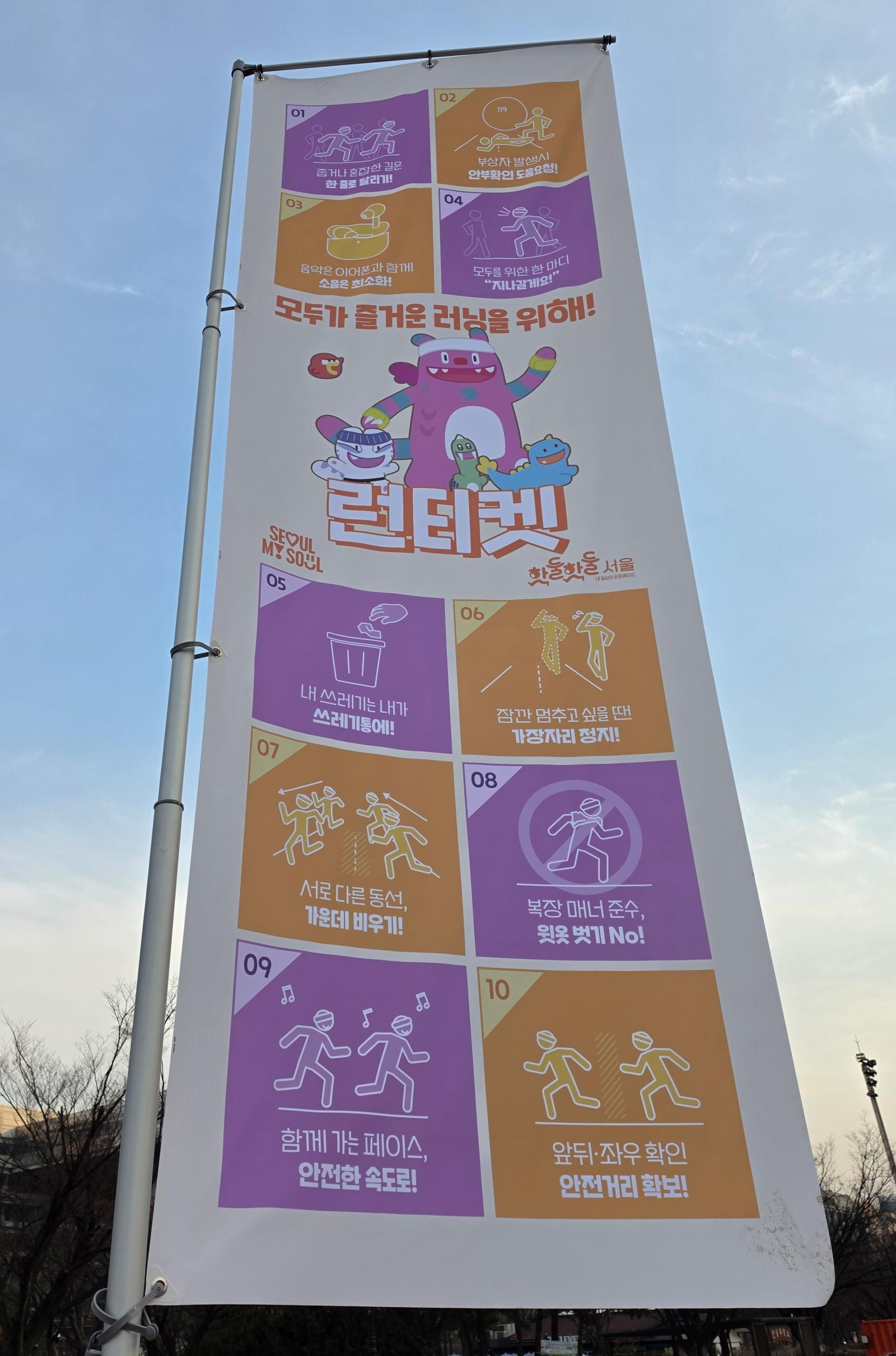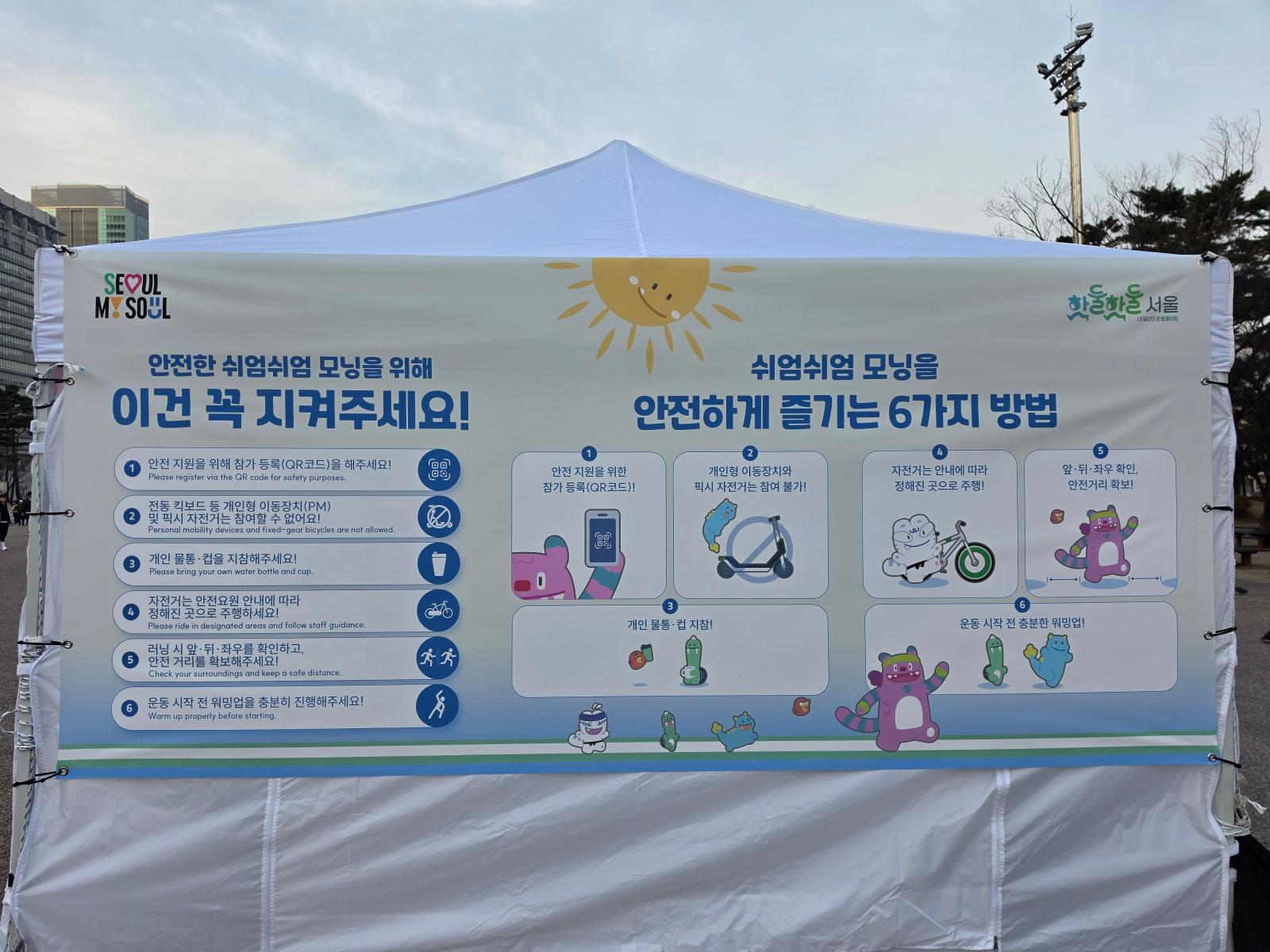 특히 제 눈길을 끌었던 것은 귀여운 해치와 소울프렌즈가 알려주는 '모두가 즐거운 러닝을 위해!' 캠페인이었습니다. '내 쓰레기는 내가 쓰레기통에!', '앞뒤, 좌우 확인! 안전거리 확보' 등 재미있는 그림과 함께 10가지 실천 방법이 소개되어 있어서 머리에 쏙쏙 들어왔습니다.