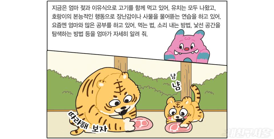 요즘엔 엄마와 많은 공부를 하고 있어. 먹는 법, 소리 내는 방법, 낯선 공간을 탐색하는 방법 등을 엄마가 자세히 알려 줘.