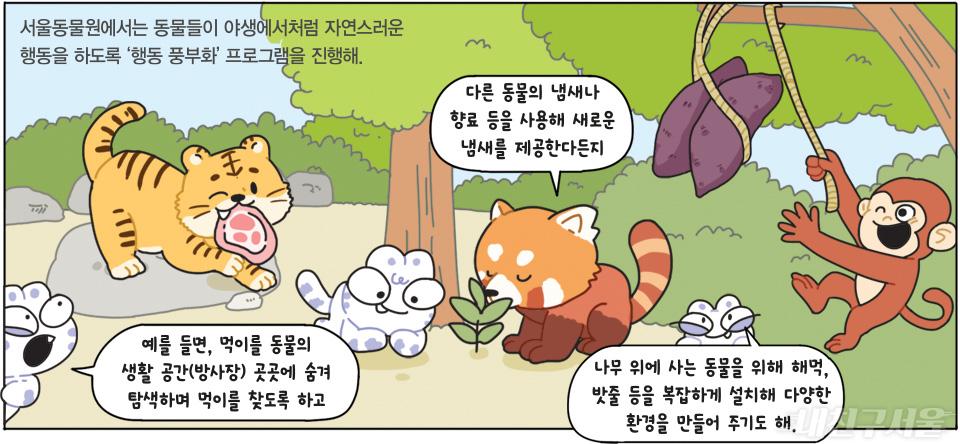 - 서울동물원에서는 동물들이 야생에서처럼 자연스러운 행동을 하도록 ‘행동 풍부화’ 프로그램을 진행해.