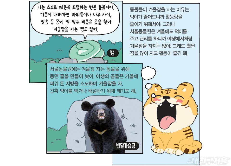 - 서울동물원에는 겨울잠 자는 동물을 위해 동면 굴을 만들어 놨어. 야생의 곰들은 가을에 찌워 둔 지방을 소모하며 겨울잠을 자. 간혹 먹이를 먹거나 배설하기 위해 깨기도 해.(반달가슴곰)