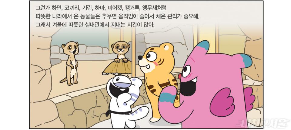 - 그런가 하면, 코끼리, 기린, 하마, 미어캣, 캥거루, 앵무새처럼 따뜻한 나라에서 온 동물들은 추우면 움직임이 줄어서 체온 관리가 중요해.